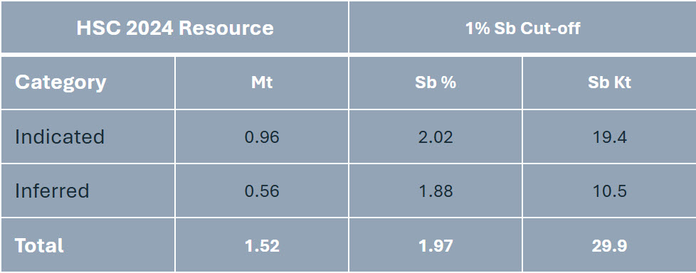 - JORC 2012-Compliant Mineral Resource: 1.52 million tonnes at 1.97% antimony (Sb), containing 29,902 tonnes of antimony.
