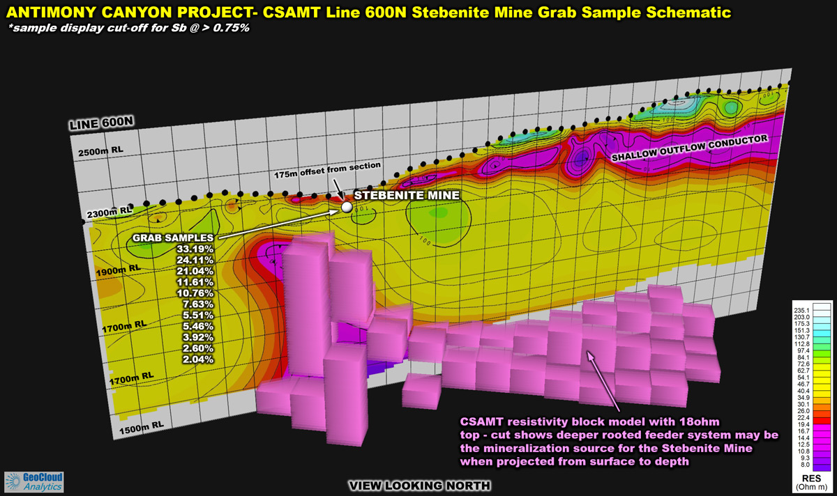 Recent exploration, including results from the CSAMT survey, has identified north-northwest-trending vertical faults, or “feeders,” that serve as conduits for metal to rise. The highest grades are found where these vertical feeders intersect with the horizontal “sponge” rock. Recent testing in these zones has yielded exceptional grades, such as 33.2% antimony, confirming that the system can carry very high metal concentrations.