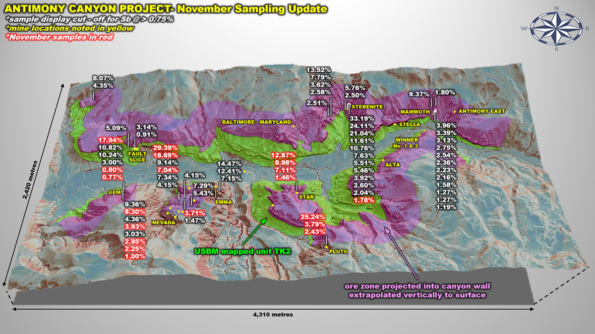 This new model demonstrates that mineralisation extends laterally along NNW-trending feeder systems, linking historic mines on the northern and southern flanks of Antimony Canyon—such as Emma and Stebinite—and continuing through to Dry Wash Canyon, located approximately 10 km to the north. Together, these areas form a single, extensive, laterally continuous mineralised system. Rather than targeting isolated, narrow veins, the Company can now focus on a broad, continuous body of mineralisation that may be well suited to modern bulk mining methods.